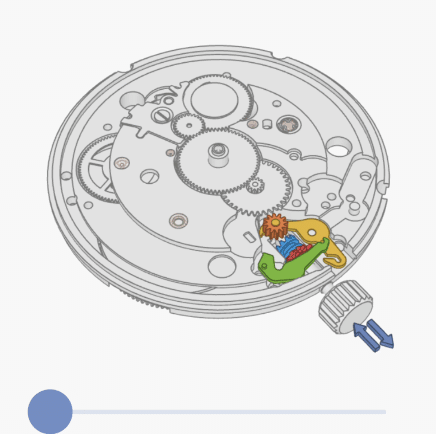 通過轉動撥針輪,我們就可以設置手錶上的時間,但要轉動該輪,我們需要滑動離合輪與其嚙合,以便錶冠和連接的離合輪旋轉撥針輪: