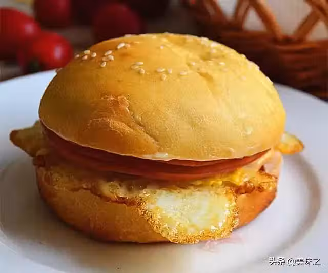 9、在麵包上塗上色拉醬,夾入雞蛋和火腿即可。