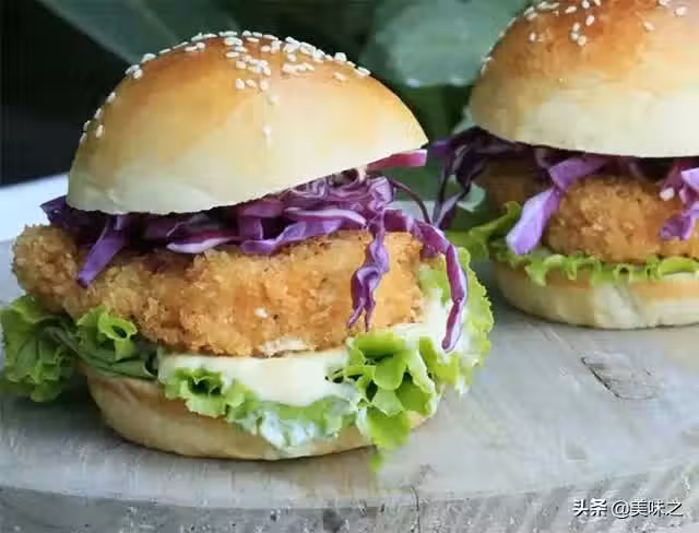 小麵包2個、雞肉1塊、生菜4片、紫甘藍少許、沙拉醬適量、麵包糠50克、雞蛋1個、澱粉50克、鹽1勺、橄欖油1勺、黑胡椒粉少許、辣椒粉1勺。