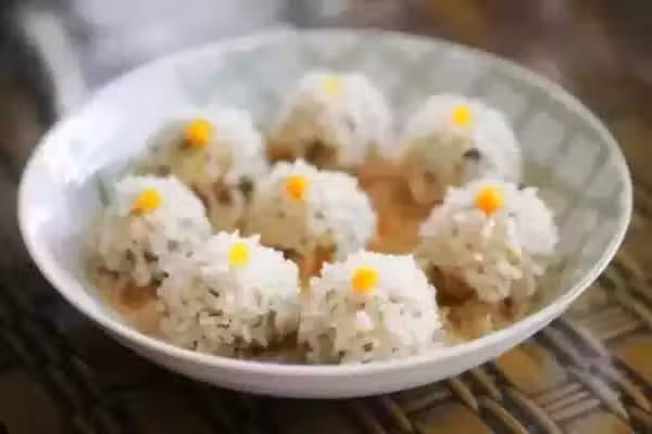 5.把攪拌好的豆腐肉泥在步驟1中的糯米裡滾一滾。