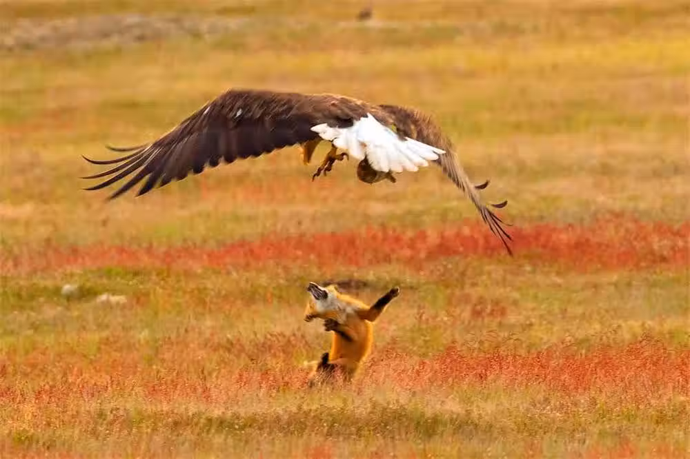 紅狐活捉野兔卻被白頭鷹搶走,不甘心向前竟被帶到空中,記仇紅狐將白頭鷹老巢一窩端!