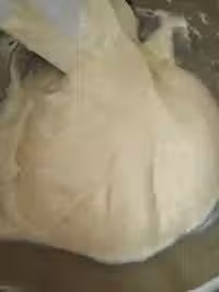 7.用融化的黃油,倒在橡皮刮刀上,這樣就可以分散到麵糊表面,用上一步的方式均勻攪拌