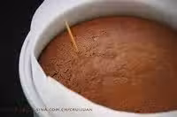 18.出模,將旁邊的烤制去掉,桌面放濕的面巾,將蛋糕倒扣。