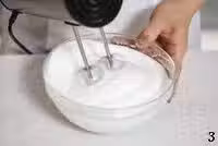 4.將蛋白打發到如圖所示的濕性發泡狀態就可以了(提起打蛋器,蛋白拉出彎曲的尖角)