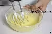 8.盛1/3蛋白到蛋黃糊里,用橡皮刮刀從底部往上翻拌的方式拌勻