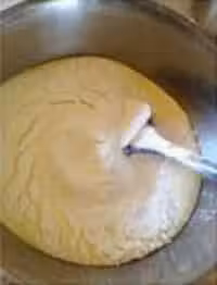 12.取出一直放在溫水中的黃油糊(約40度左右),順著刮刀倒入蛋糊中
