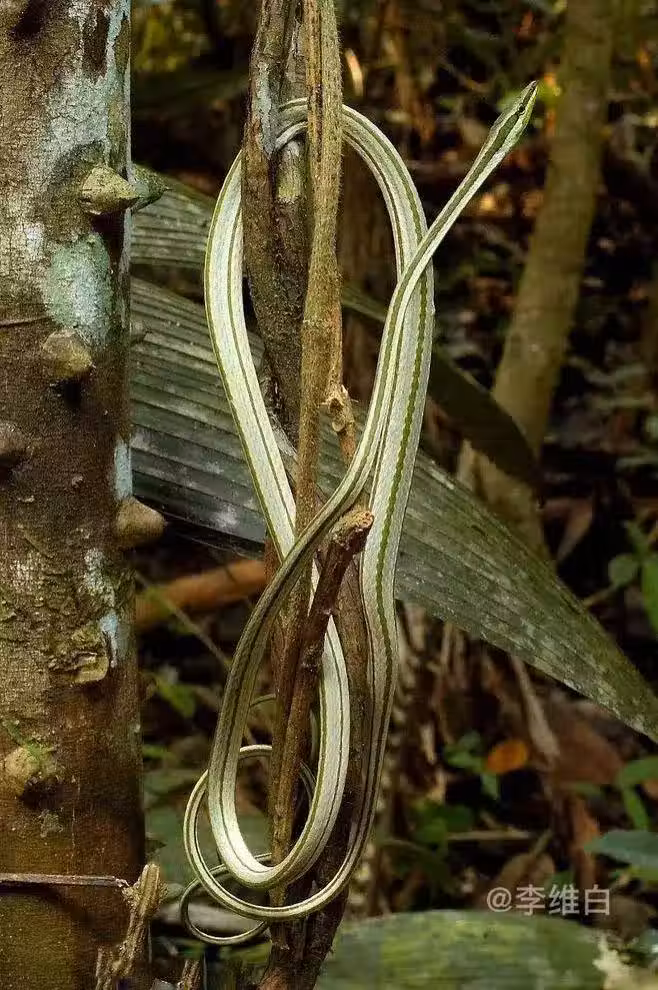 蛇身呈灰綠色、黃色、橙色、灰色和棕色,有一些模糊的橫帶紋,舌黃色或者紅色,舌尖黑色,常常用來引誘獵物。再加上細長的身子,乍一看很像一根藤條,藤蛇之名也由此而來。