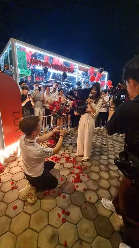 根據面子書流傳的照片可見,該名年輕男子在街頭當著親朋好友面前,單膝跪在女友前,手上捧著一枚戒指,女友身後則是一輛透明包廂羅厘,裡頭運載一輛黑色保時捷跑車。