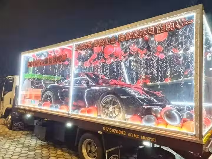 《中國報》記者今日聯絡上有關透明包廂羅厘業者,他證實應客戶要求,於昨日情人節,運載一輛保時捷跑車在新山茂奧斯丁花園的商業街。