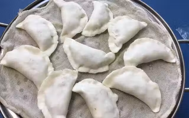 9、水燒開放上帘子,帘子上鋪上屜布,放入做好的生坯,蓋上蓋鍋大火燒開。水開就可以開始計算時間,大約六分鐘就可以。因為是燙麵並且餡又是容易熟的食材。