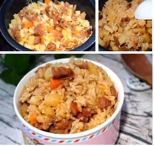 3.大米洗凈後放入電鍋,然後將拌好的食材鋪到米上面,加水沒過食材即可。