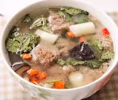 2鍋內加水燒開,牛肉糜用小勺做成肉丸下到鍋內;中小火慢慢燒開,肉丸成型以後加入山藥、香菇;慢慢熬煮,撇去湯表面的浮沫,熬10分鐘左右即可;盛入碗內,加胡椒粉、香菜就可食用,美味無敵哦。