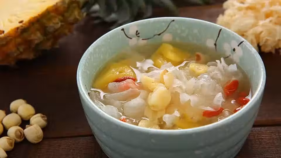 3、轉小火燉60分鐘,加入冰糖、菠蘿塊、枸杞