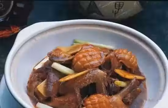 4、鍋入底油燒熱,放姜、蔥炒香,放入乳鴿塊、鮑魚、冬菇,再入白糖、炸蒜、鹽、花雕酒、老抽和100克清水,蓋上蓋子燜約2分鐘至熟即可。