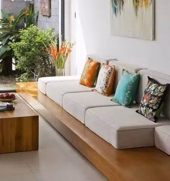 傳統的客廳三件套是沙發、茶几、電視。作為家裡重要會客場所,沙發自然是不能少的。但是如今年輕人覺得太常規、沒有創意,那該怎麼辦呢?那不如直接在客廳砌個地台,漂亮易打理,越坐還越舒適。