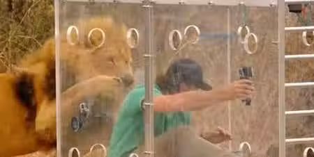 而且大家可能都想像到了,他的做法就是把自己裝進這個玻璃箱裡面,然後放到這個野外的獅子群中,看看獅子有什麼樣的反應。但是獅子的反應,也是讓他非常後悔了,因為獅子是直接向他撲過去了,而且還想要把這個籠子給咬爛。