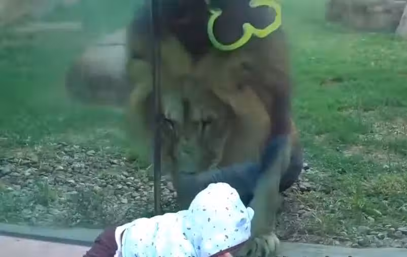獅子看到小寶寶瞬間「獸性大發」,不料寶寶回頭一看,獅子反應太逗了