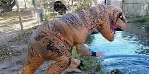 老外穿上恐龍服裝,襲擊水池中的鱷魚,「鱷魚的行為」把人看懵了