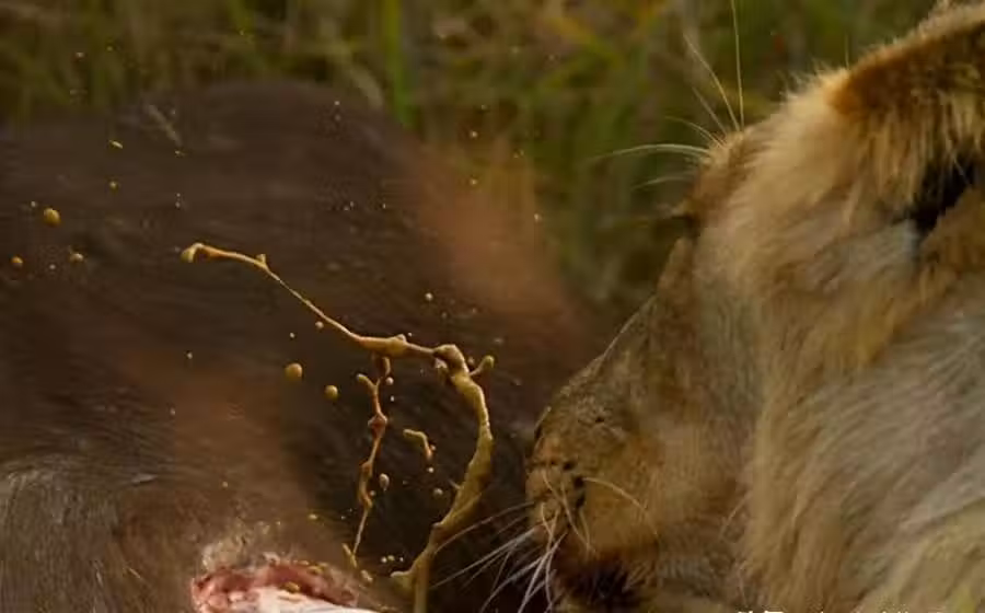 饑腸轆轆的母獅按倒野牛,剛要美餐下秒「屎漿噴滿臉」,母獅表情複雜生無可戀