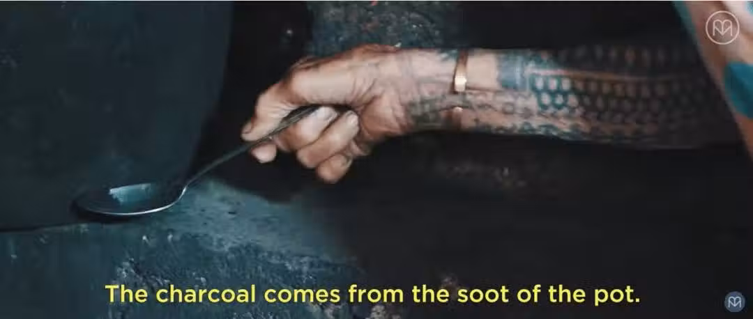從小就跟著刺青師爸爸學習古老刺青記憶的瑪利亞,用的工具都是純天然的,例如水、竹籤以及煤灰等等,她一手輕拍木棍,一手快速敲擊,長刺以每分鐘100次的頻率扎入肌膚, 墨水混合鮮血,形成一幅古老的圖騰。