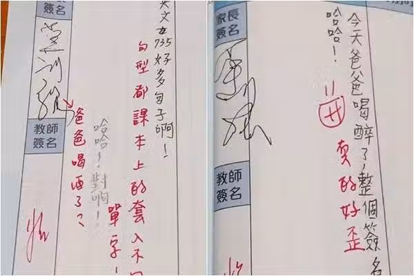 後來隔幾天爸爸的簽名又以「草書」簽名,老師還主動拉箭頭問學生「爸爸喝酒了?」,而表弟也誠實的回答「哈哈!對啊!」網友看了紛紛表示「從筆跡就可以透露爸爸一個禮拜喝幾天」、「我覺得這個兒子很誠實」