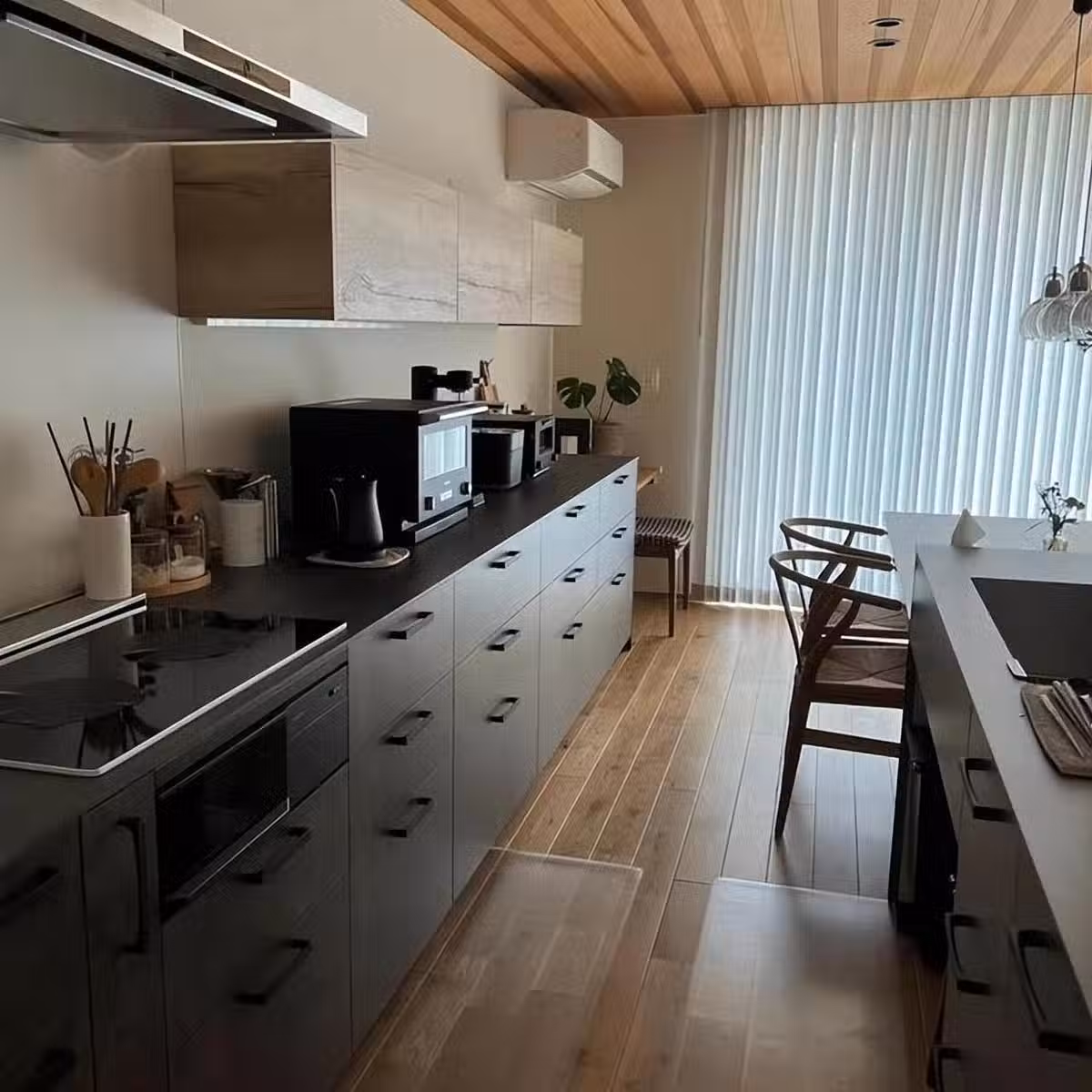 淺色系的餐桌椅中規中矩,看似簡單卻很實用。和深色系的島台緊緊相連,再度把「節約空間」的理念發揮到極致。