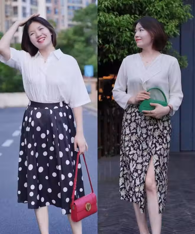 收腰上衣+印花半身裙:如果你是腰腹部比較有肉的話,上衣塞下裝的方式會容易暴露腰部贅肉,那我們可以選擇略微收腰的上衣搭配一條半身裙,這樣的話就可以起到既可以展露腰線,又能夠起到很好的顯瘦效果。