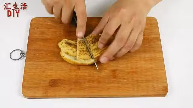 我也把香蕉皮切一下,把香蕉皮切碎就可以,切得越小越好,因為香蕉皮本身就有一種味道發甜的味道,這樣蟑螂自然會跑到香蕉皮上來,我們把香蕉皮切完之後然後準備一個盤子,把香蕉皮放在盤子裡邊兒,這時我們在盤子裡邊兒倒入一點清水,沒過香蕉皮就可以了,