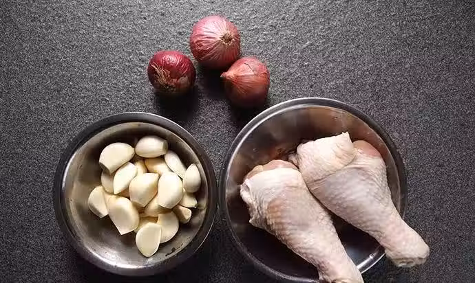 雞腿剔肉切大塊,用少許鹽和黃酒抓腌一下,洋蔥切小塊,蒜切兩半備用