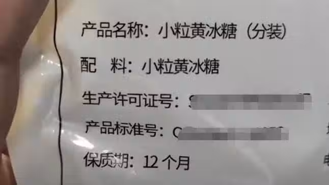第一個方法,看配料表。是甘蔗糖和水的,這就是真的黃冰糖配料表。像這種就是散裝的冰糖,它連這個原材料都不敢給你標注出來,這種原材料,要麼是糖渣,要麼是白砂糖,這就是劣質的黃冰糖,不建議買。