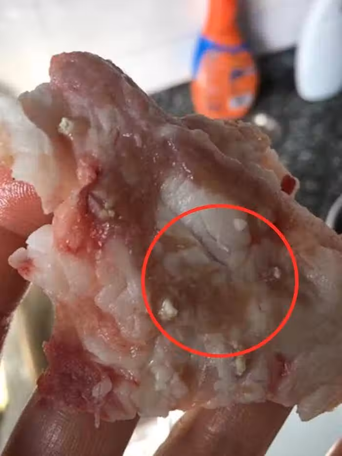 這個白色肉疙瘩的部位,就是病菌和細菌殘留的部位,所以說這樣的豬肉再便宜也不要購買,大家一定要注意哦,