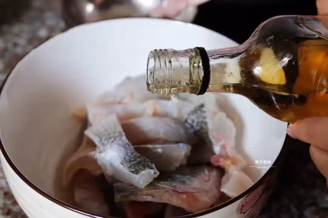 2、鱸魚切下魚肉,保留魚頭和魚骨相連的部分,把魚肉放在碗里,加入蔥姜水以及少量的料酒,腌制10分鐘去腥。料酒要在腌制的時候加入,而不是在燉的過程當中加入,這樣才能起到去腥的作用。