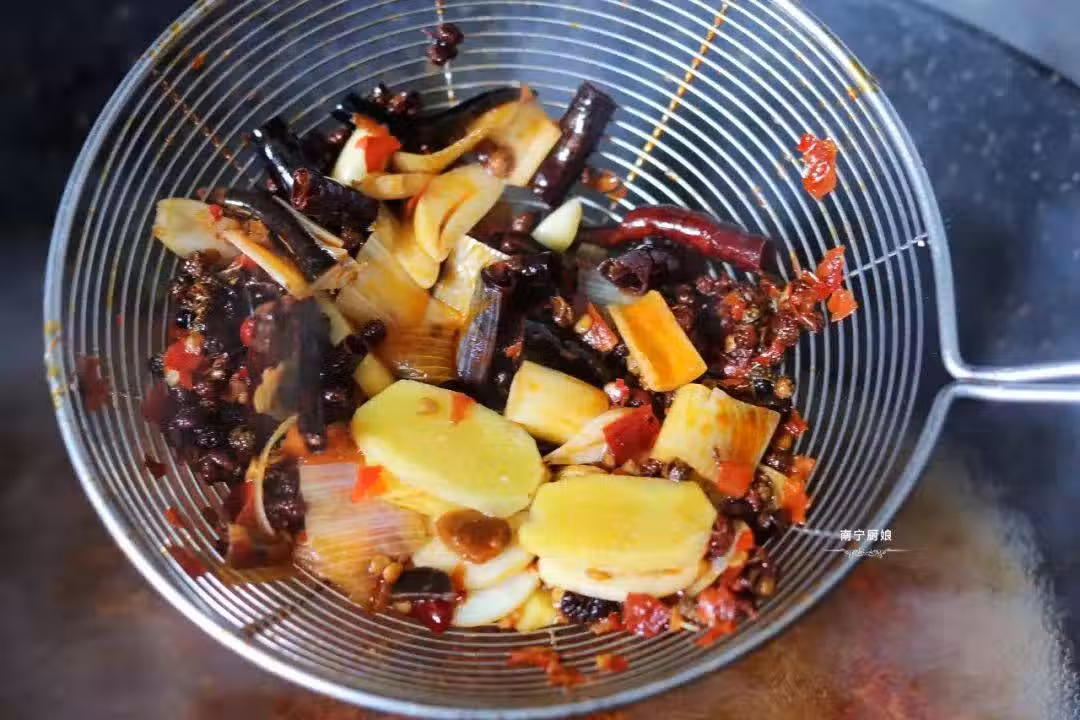 5、等鍋中的水沸騰之後,加入一勺食用鹽進行調味,攪拌均勻之後用一個漏勺,把鍋里的香料全部都撈出來,只保留湯汁。