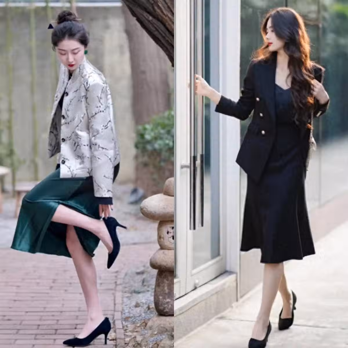 如果想要塑造出更有女人味的風格,那我們再具體搭配時就要多加註意露膚度。若是你的小腿線條十分纖細,那最好是選擇「剛好過膝蓋」或是「能夠露出小腿肚」的裙子來搭配低跟鞋。將小腿部分露出來,結合上低跟的設計可以更好的拉長腿部比例,穿出大長腿的效果。