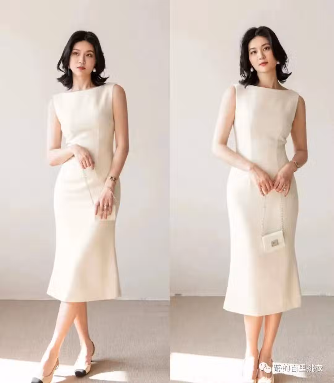 奶白色的連衣裙,順滑輕柔的面料,加上貼身流暢的剪裁,輕輕鬆鬆地演繹出了簡約貴氣的風采。