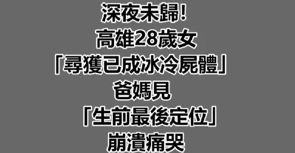 深夜未歸!高雄28歲女「尋獲已成冰冷屍體」 爸媽見「生前最後定位」崩潰痛哭