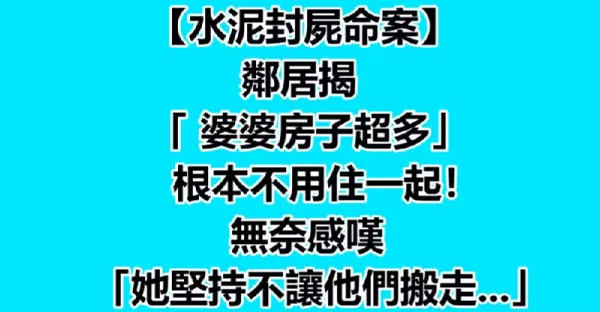 【水泥封屍命案】鄰居揭「婆婆房子超多」根本不用住一起!!無奈感嘆:「她堅持不讓他們搬走...」