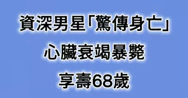 資深男星「驚傳身亡」!心臟衰竭暴斃 享壽68歲