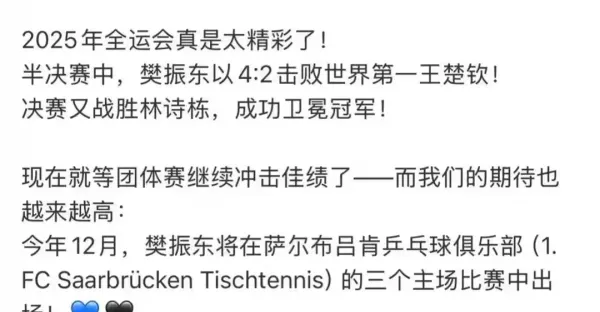 樊振東12月重返德甲,出戰三場主場戰