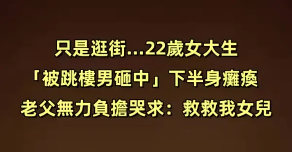 只是逛街......22歲女大生「被跳樓男砸中」下半身癱瘓,老父無力負擔哭求:救救我女兒