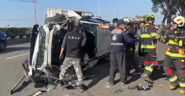 休旅車自撞路樹翻「3圈半」卡路中 1家4口傷送醫