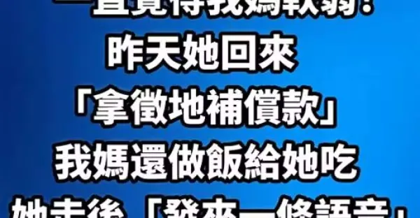 大伯母是個強勢的人 ,一直覺得我媽軟弱!昨天她回來「拿徵地補償款」我媽還做飯給她吃,她走後「發來一條語音」 我媽聽完紅了眼眶…