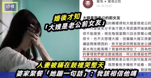 婚後才知「大嫂是老公前女友」人妻被瞞在鼓裡哭整天 婆家聚餐「她蹦一句話」:我該相信他嗎