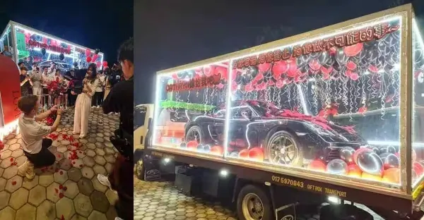 情人節滿滿儀式感 男子送保時捷 向女友求婚