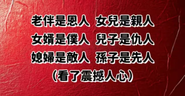 老伴是恩人,女兒是親人,女婿是僕人,兒子是仇人,媳婦是敵人,孫子是先人(看了震撼人心)