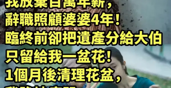 放棄百萬年薪,辭職照顧婆婆4年!她臨終前卻把遺產都分給大伯大嫂「只留給小媳婦一盆花」,1個月後「清理花盆」媳婦跪地痛哭#原來婆婆早就鋪好路