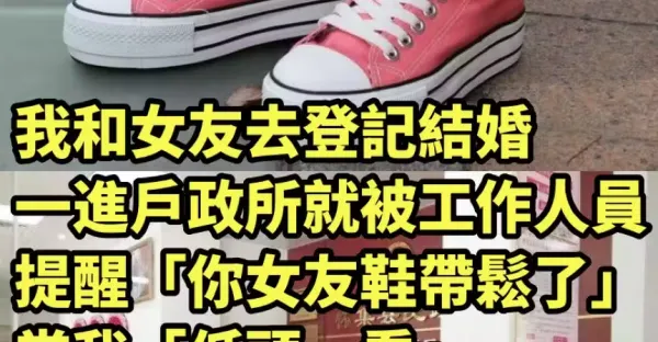 我和女友去登記結婚,一進戶政所就被工作人員提醒「你女友鞋帶鬆了」,當我「低頭一看」馬上衝出門:這婚我不結了!